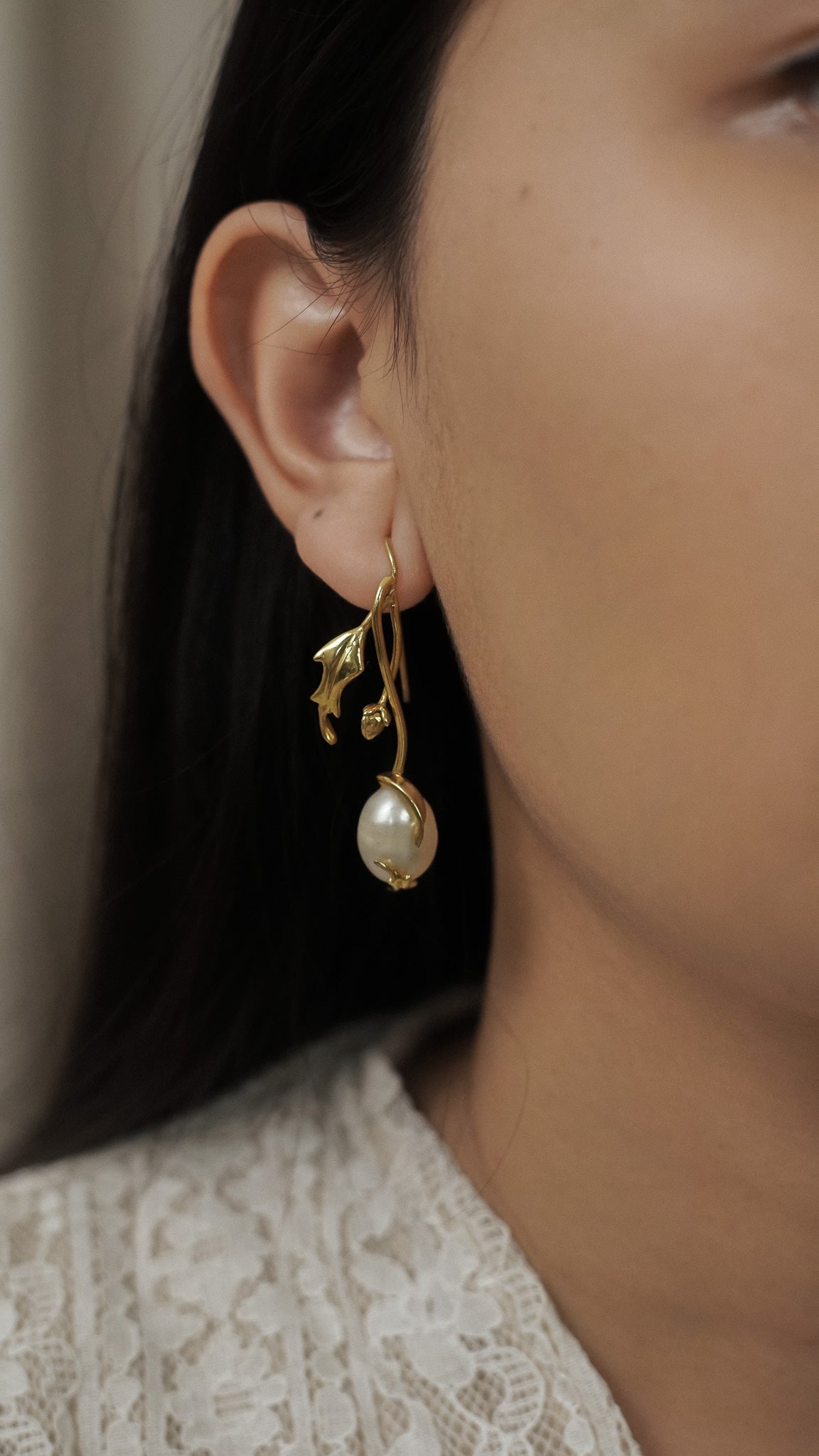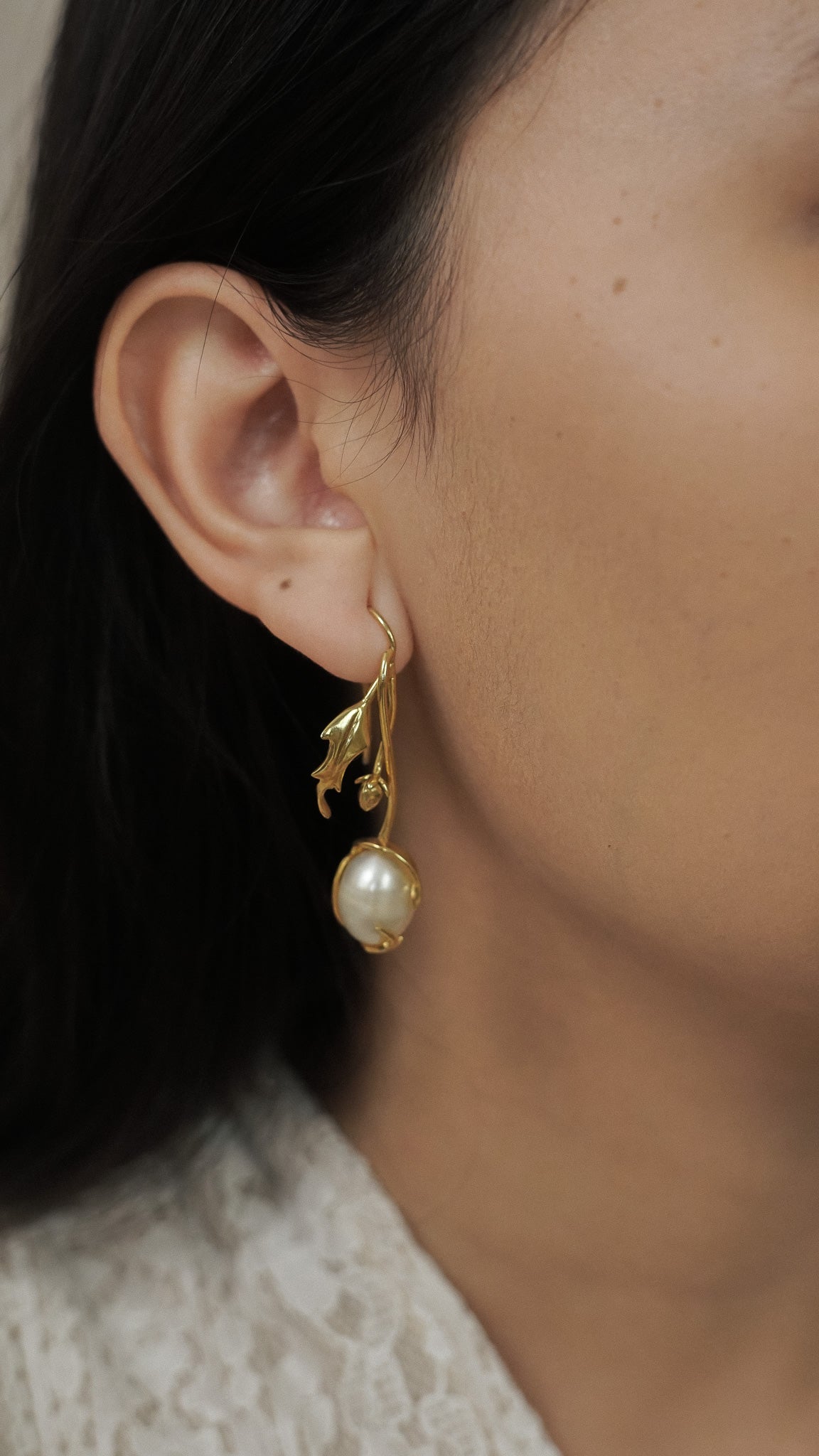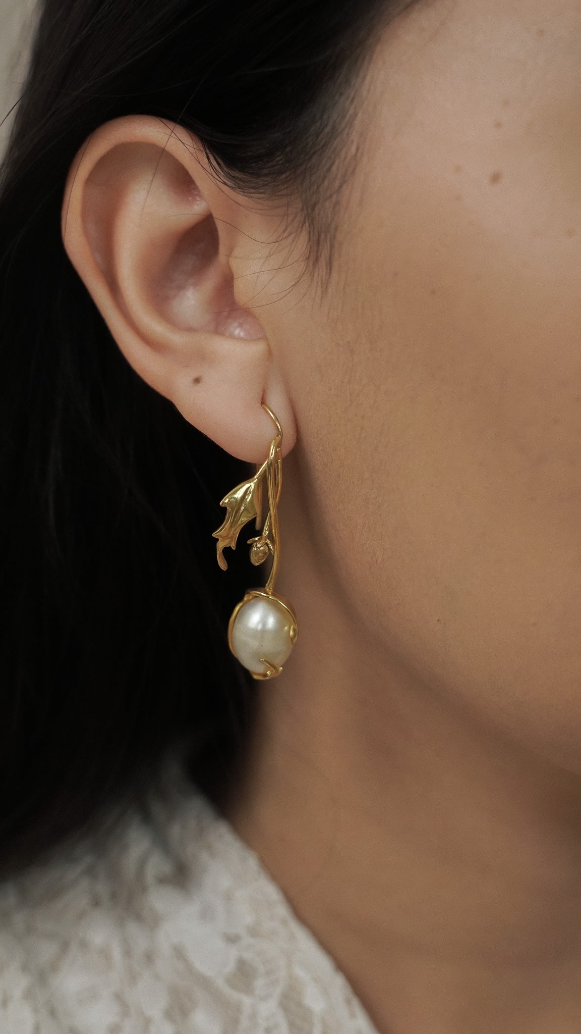 This handmade set features two different designs for each ear. On one side, a blooming chrysanthemum captures the beauty of a flower in full flourish. On the other, a delicate pearl dangles gracefully, wrapped in a curling chrysanthemum leaf. Sculpted by hand in brass and finished with a layer of gold.