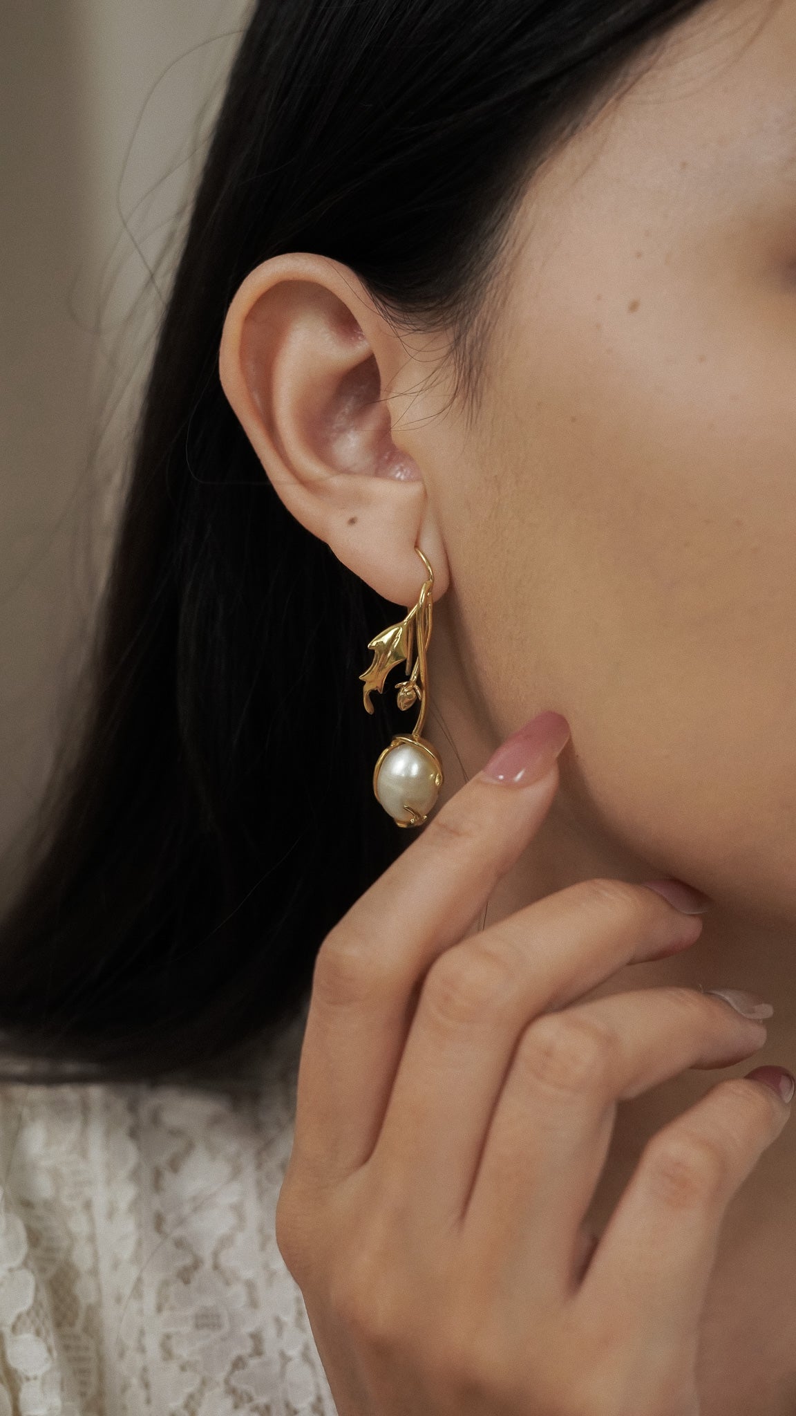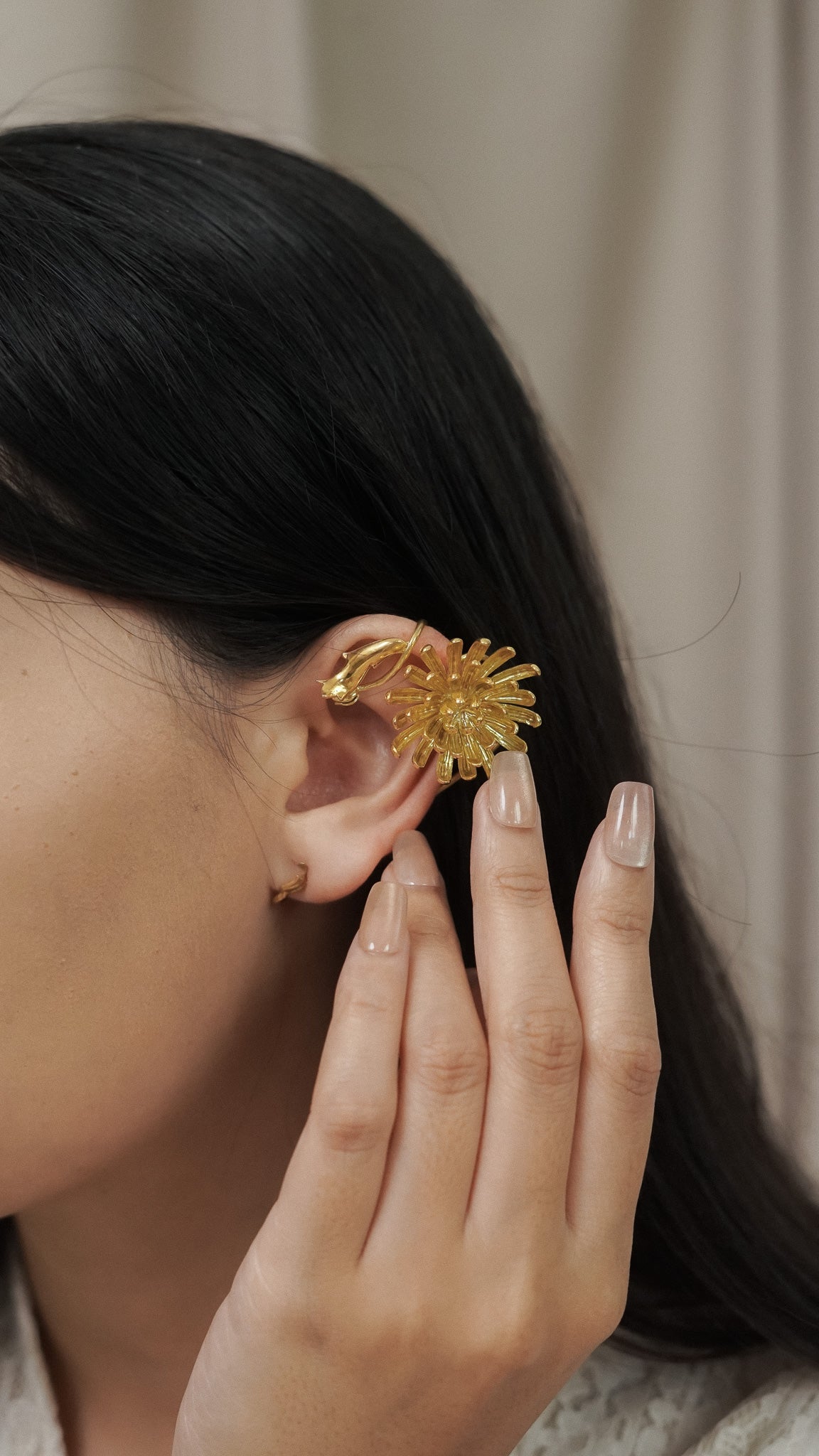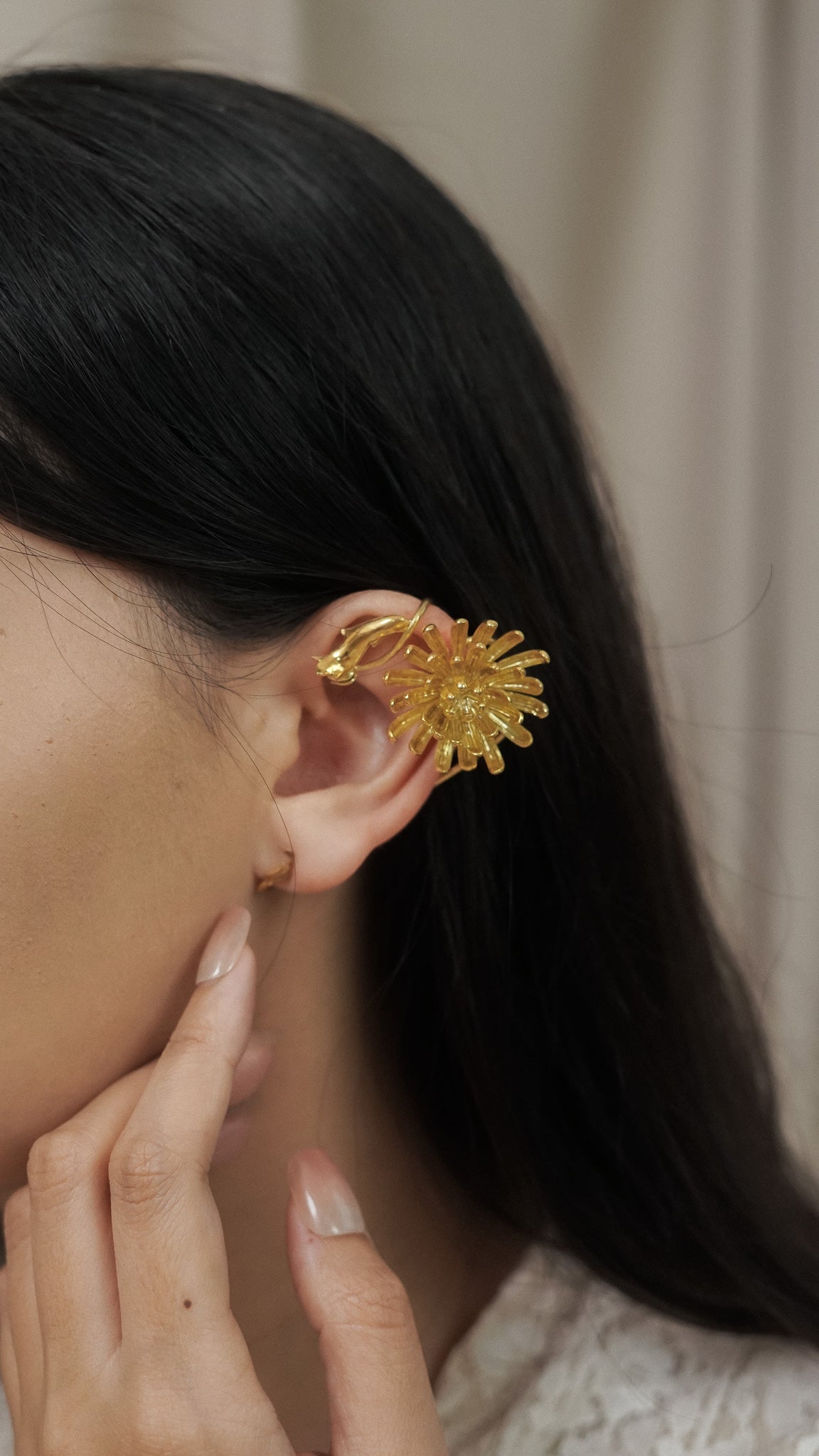 This handmade set features two different designs for each ear. On one side, a blooming chrysanthemum captures the beauty of a flower in full flourish. On the other, a delicate pearl dangles gracefully, wrapped in a curling chrysanthemum leaf. Sculpted by hand in brass and finished with a layer of gold.