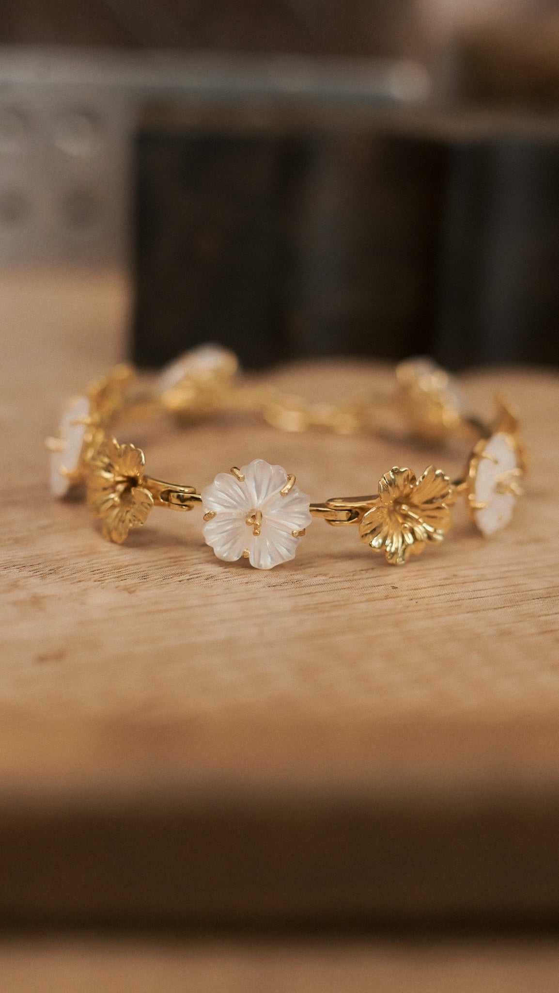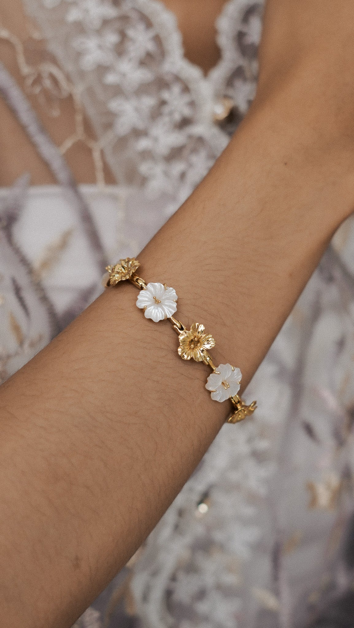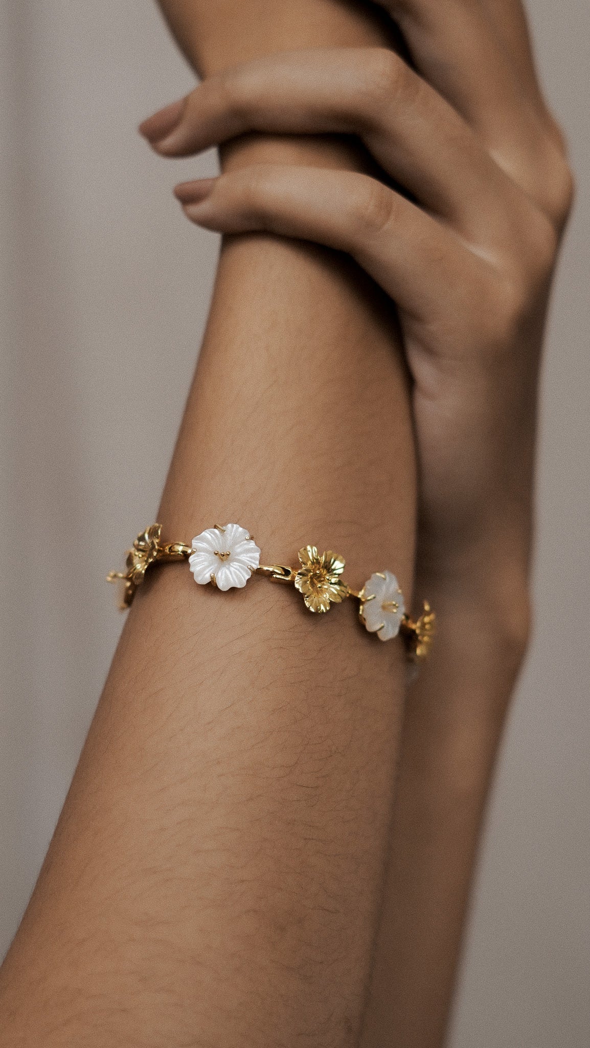 This bracelet features delicate white hibiscus flowers, expertly carved from luminous mother of pearl, giving each piece a unique iridescent glow. Paired with sterling silver gold-plated flowers.