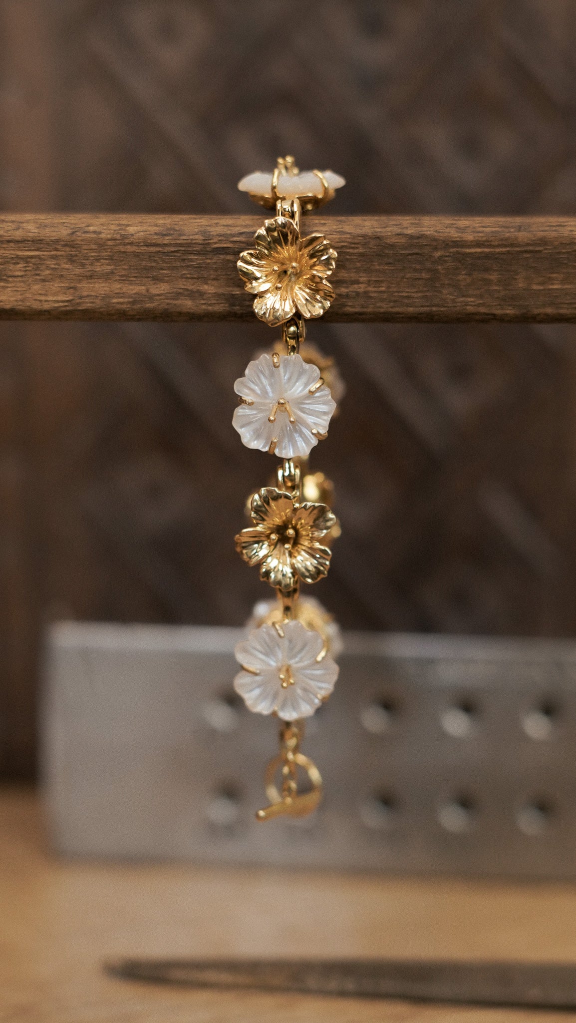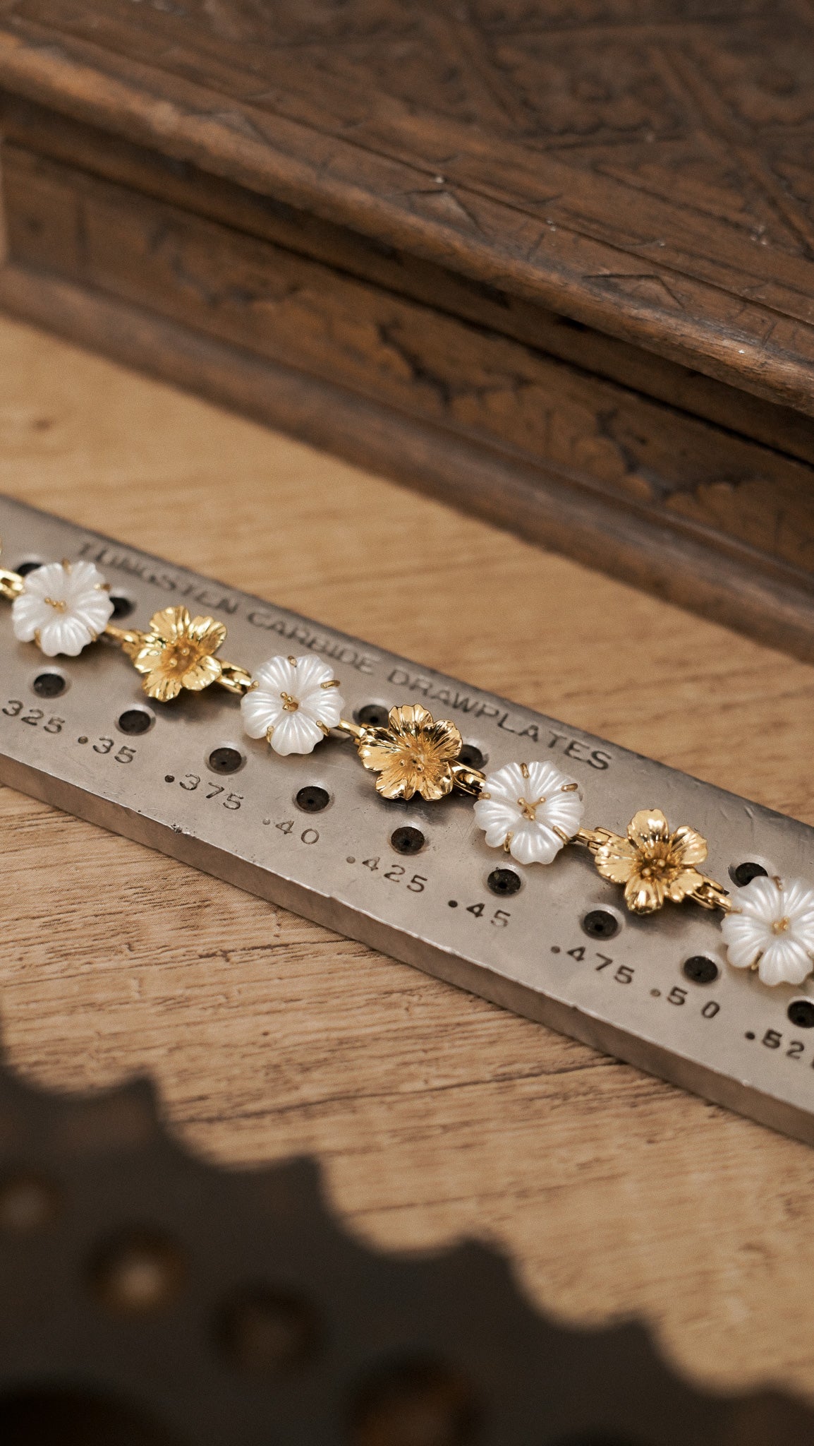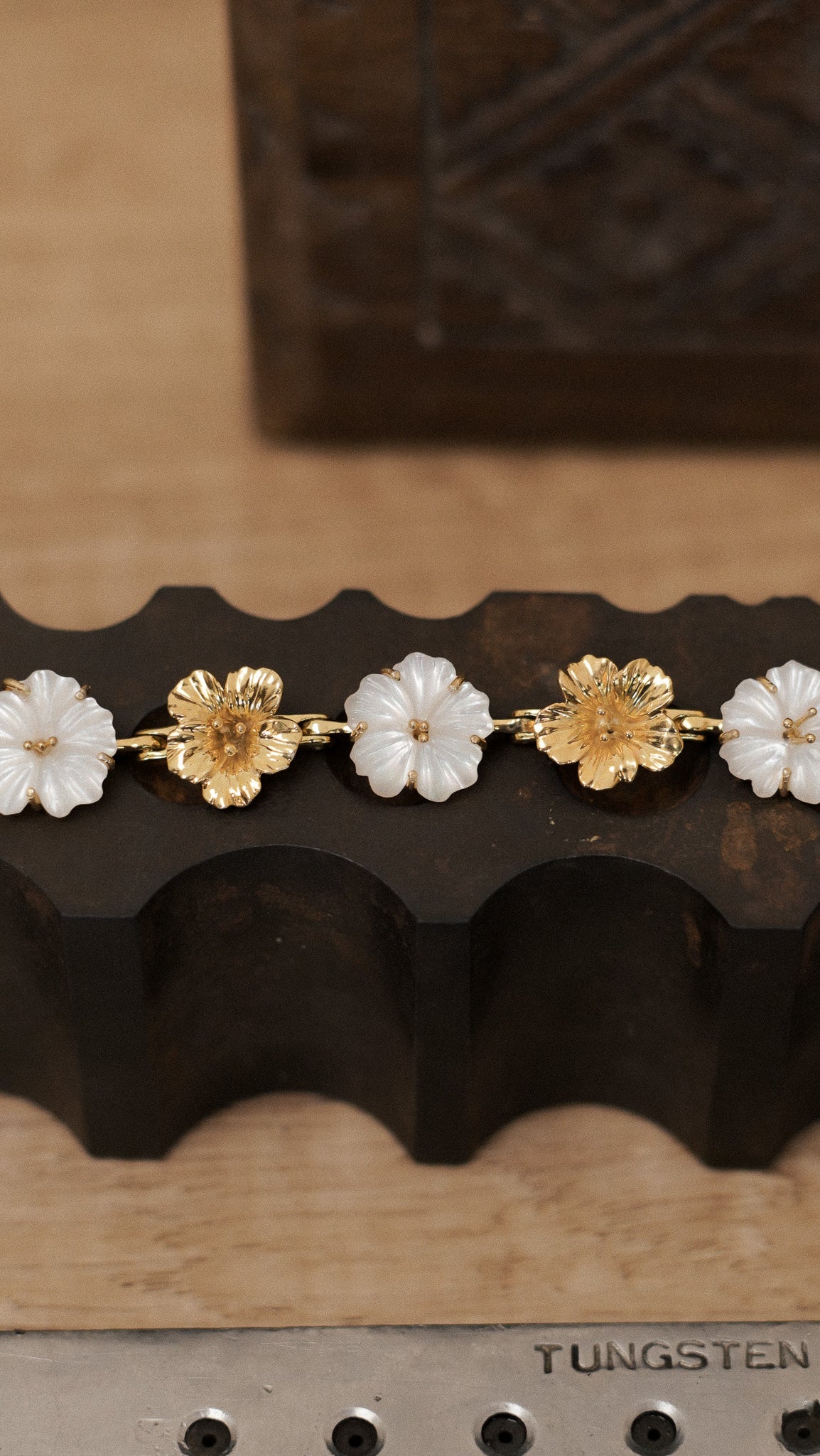 This bracelet features delicate white hibiscus flowers, expertly carved from luminous mother of pearl, giving each piece a unique iridescent glow. Paired with sterling silver gold-plated flowers.