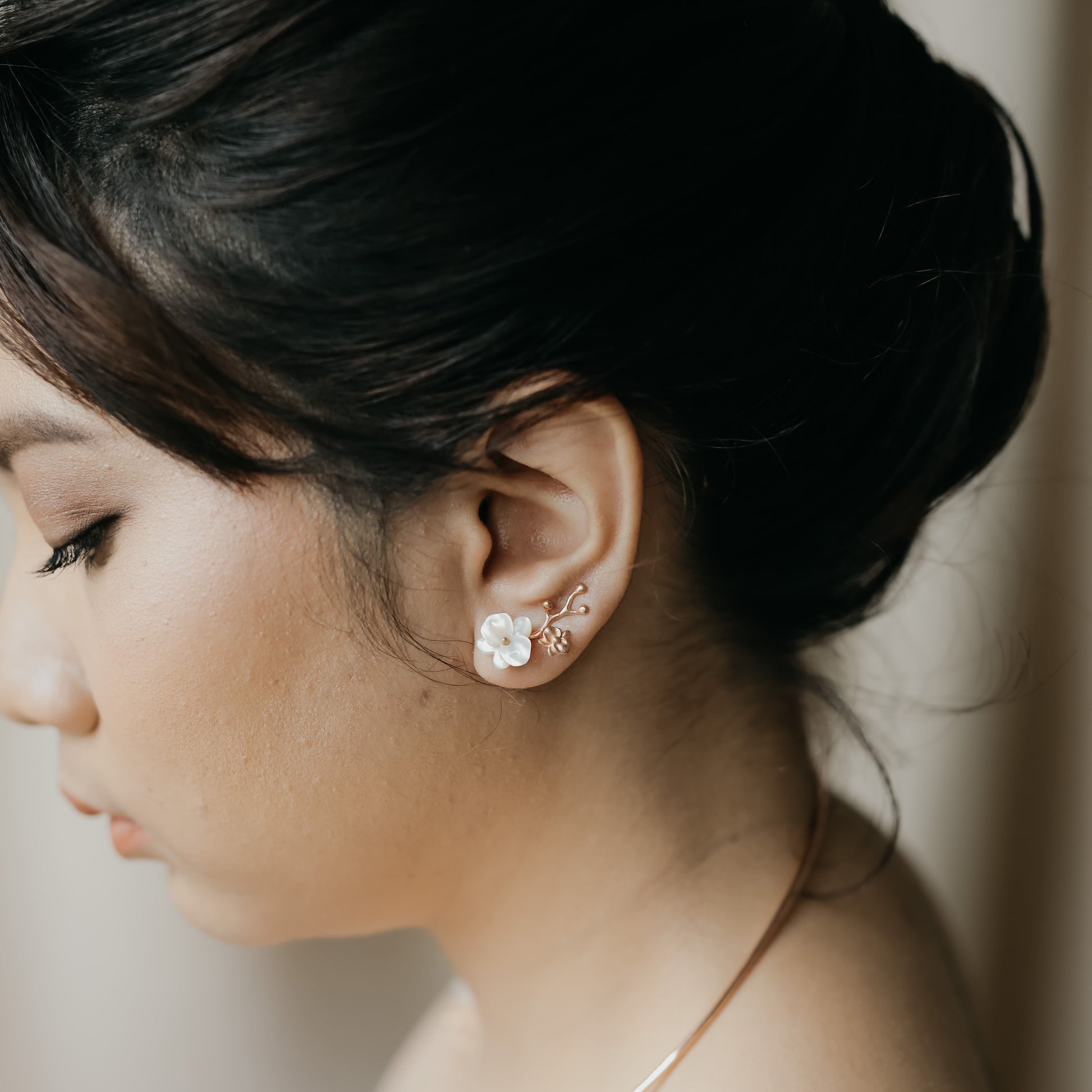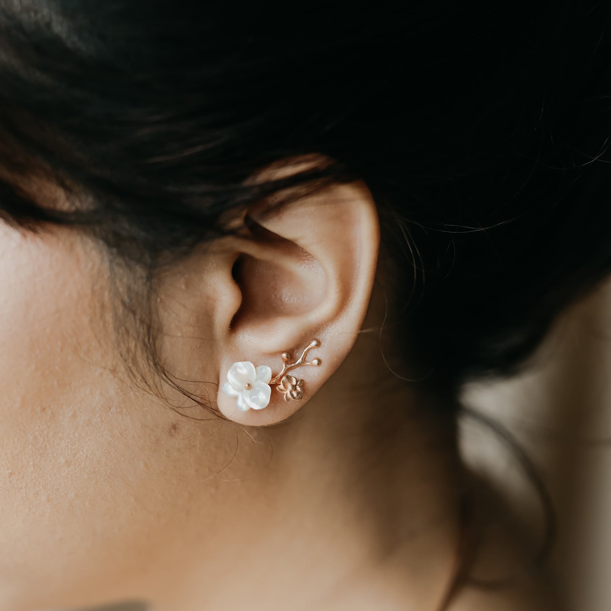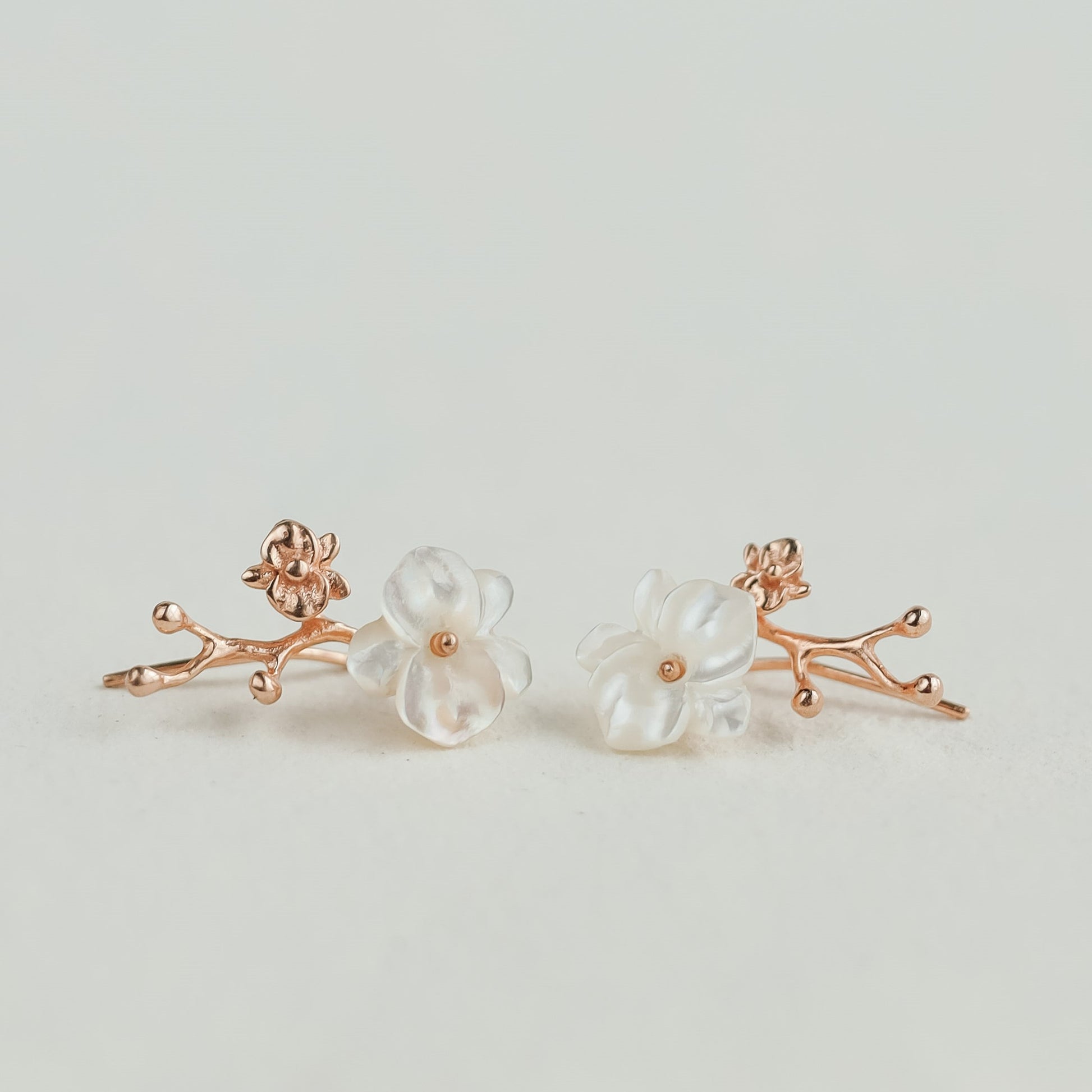 Embrace the allure of the ocean and the elegance of orchids with these captivating sterling silver orchid ear climbers adorned with iridescent Mother of Pearl carvings. Handcrafted by skilled artisans in Bali, these unique earrings embody the beauty of nature and cultural heritage.